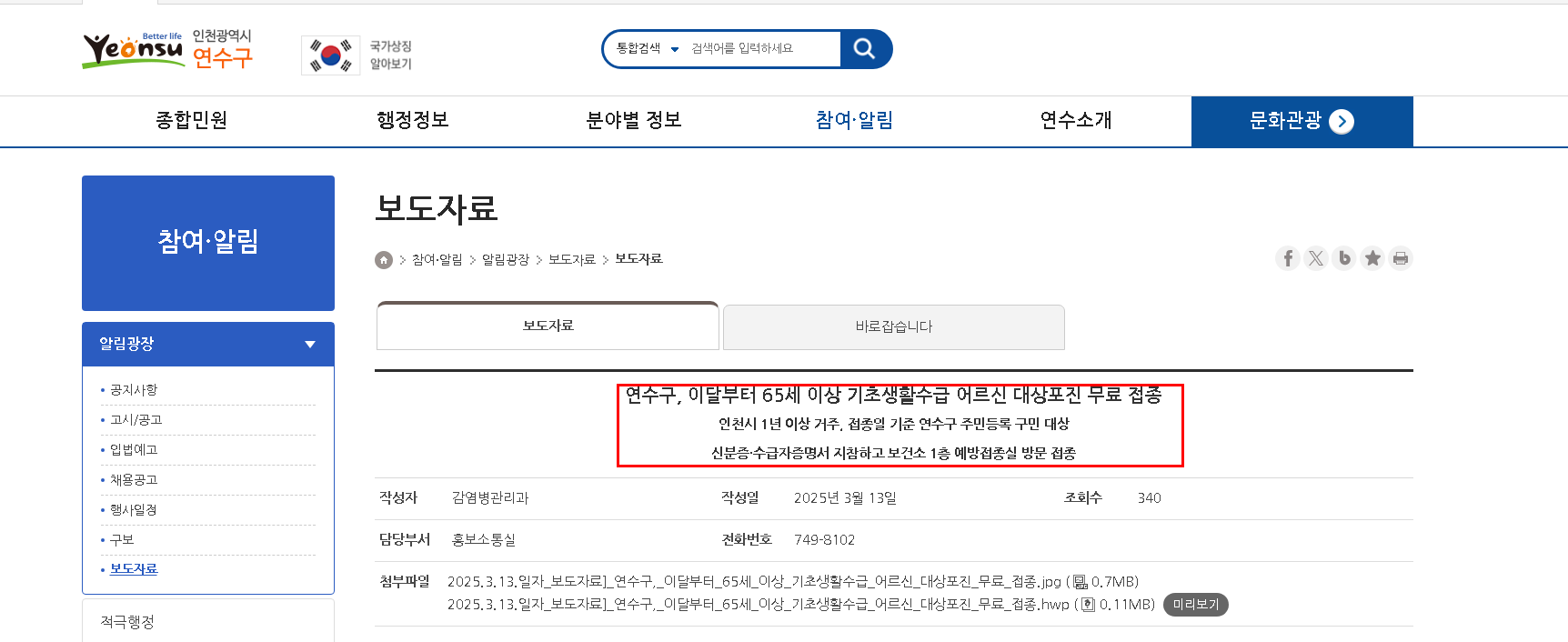 - 연수구: 기초수급자 우선 지원, 일반 어르신 대상백신 지원 추진