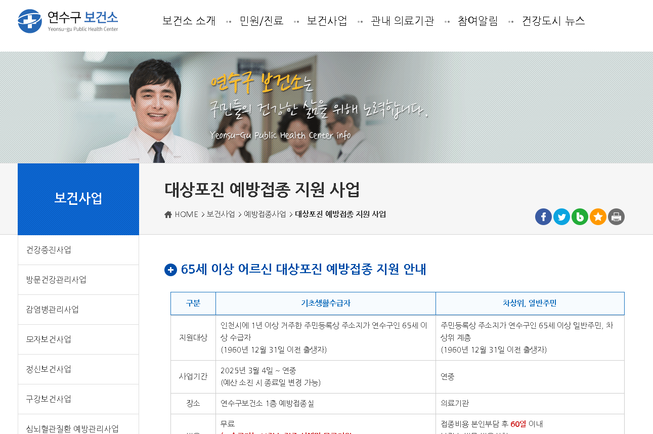 | 연수구 | 1960.12.31 이전 출생, 65세 이상 (수급자 포함) | 2025.3.4 ~ 예산 소진 시까지 | 생백신 | 연수구 안내 |